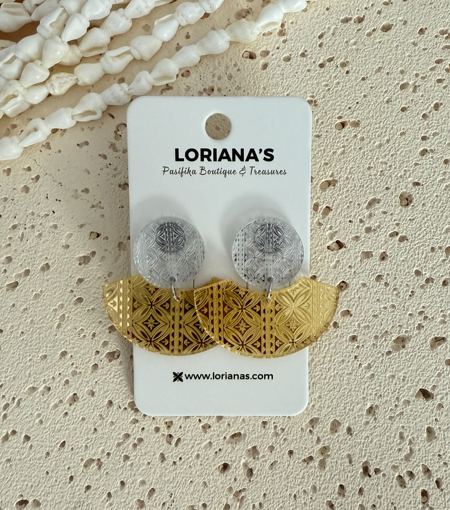 Elegant and timeless, these exclusive earrings feature a modern fan silhouette inspired by Pacific artistry. Designed by Loriana’s, they combine gold and white tones to effortlessly complement any outfit.