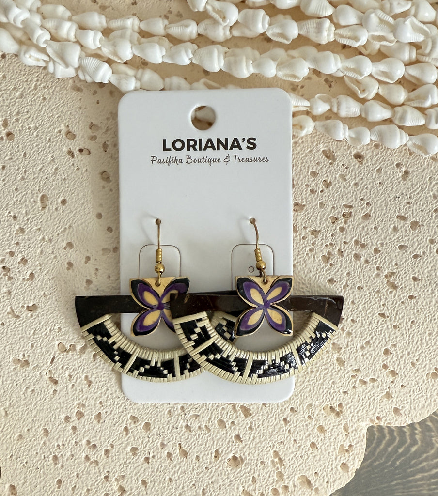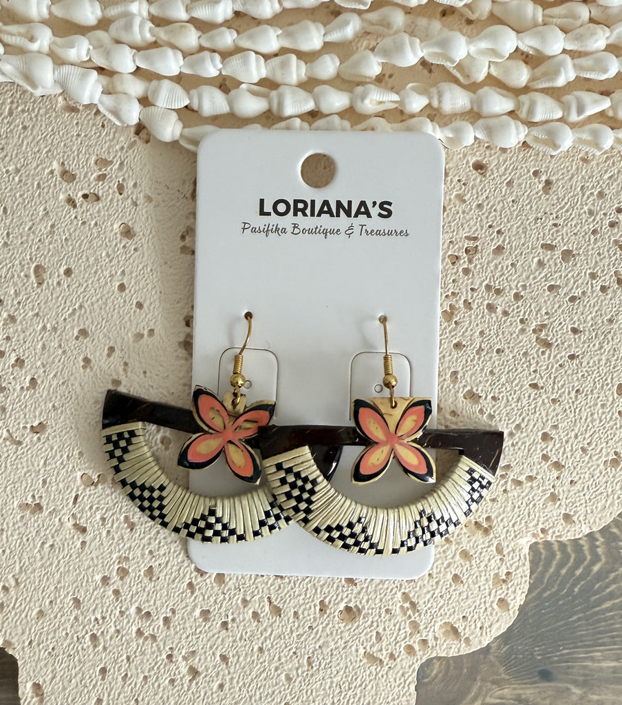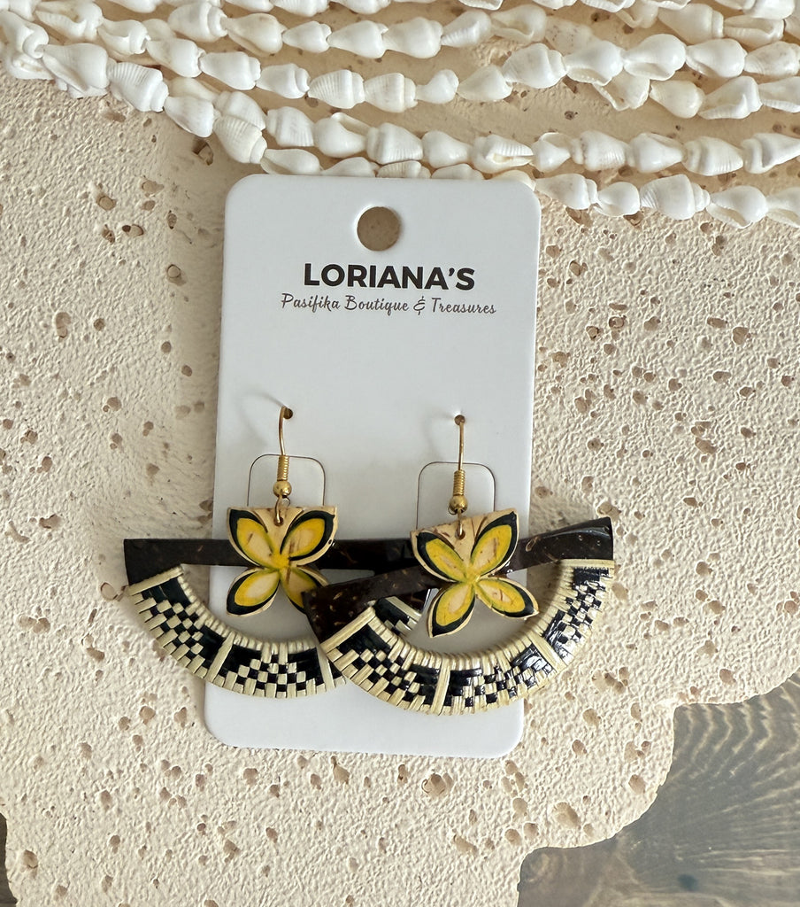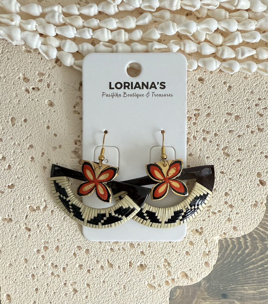 A beautiful blend of island artistry and natural charm. These stunning earrings feature the iconic tipani (frangipani) flower, delicately hand-painted and paired with authentic coconut shell and fine woven detail.